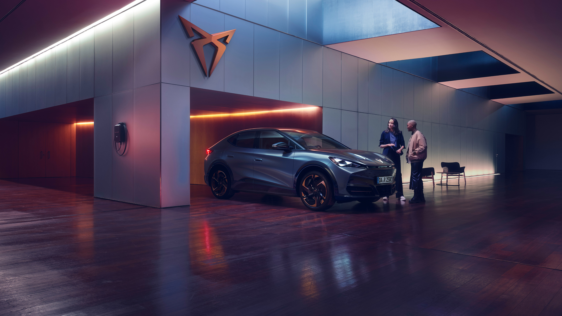 Blauer CUPRA Tavascan in einer modernen Halle mit zwei Personen im Gespräch
